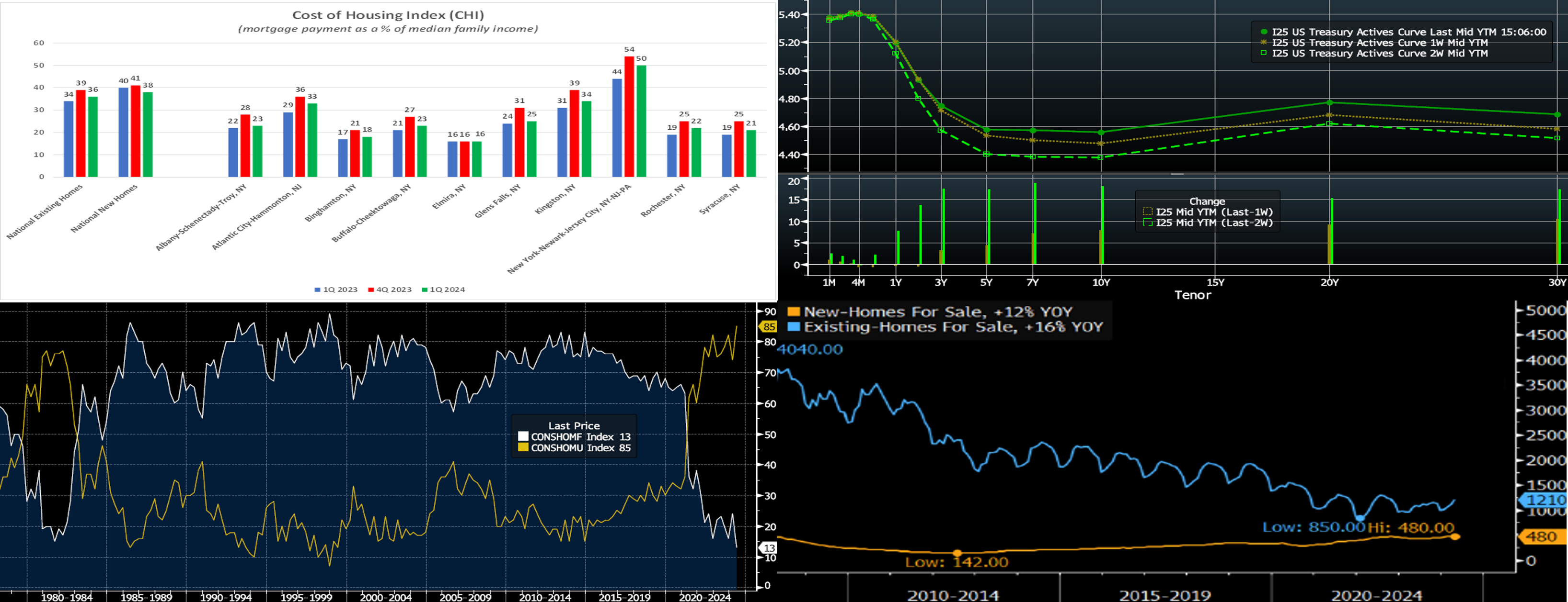 Source: Bloomberg Intelligence; National Association of Realtors; Census Bureau. Here is a potential kernel of good news for homebuying costs, at least from the supply/demand standpoint. Existing-home inventories (Blue, RHS, 000’s), while still relatively low on a historic basis, are now ~16% above year-ago levels and higher than at any point in 2023. New-home inventories (Orange, RHS, 000’s), meanwhile, are at the highest levels since the late 2000’s.
