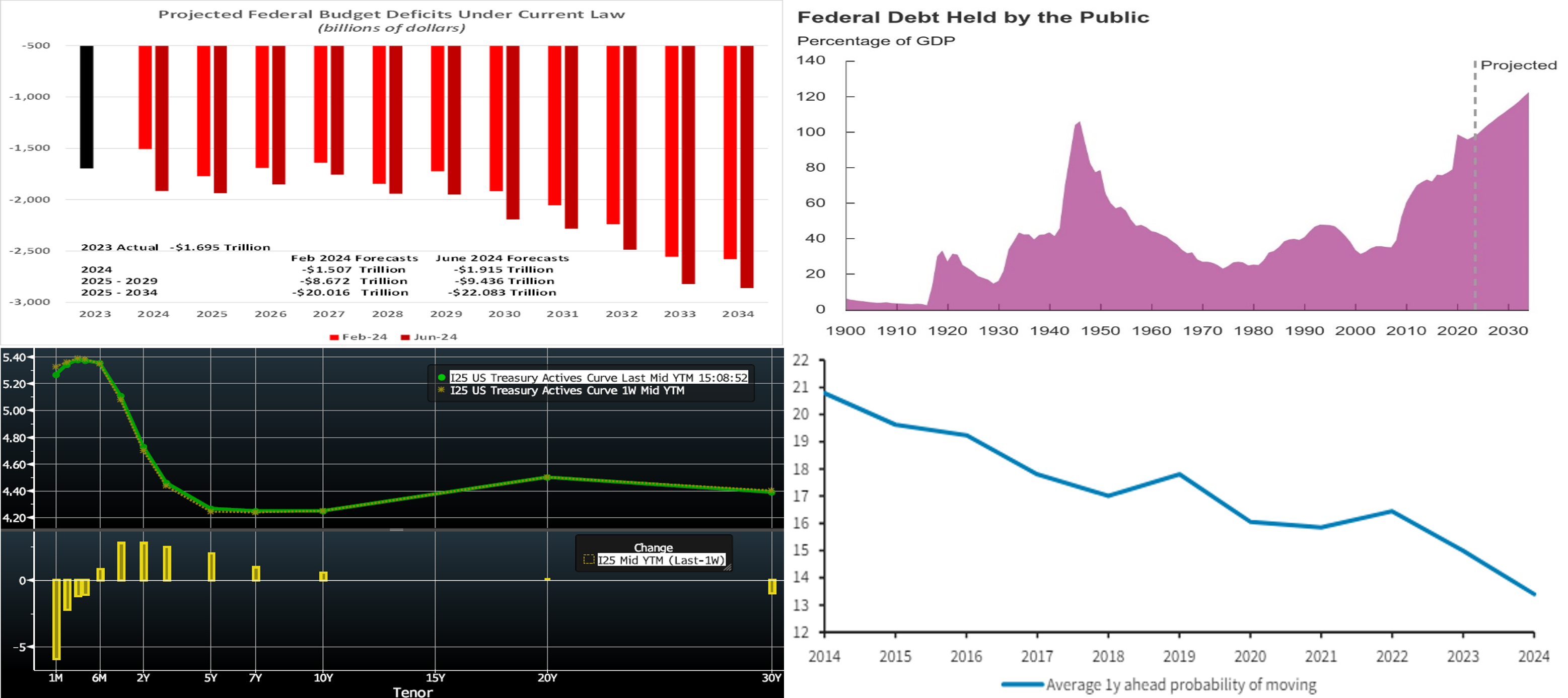 Source: Bloomberg. Top pane is yield (LHS, %), bottom pane is change (LHS, bps). As of Thursday afternoon, the UST term curve was, week-on-week, mostly higher but to a modest degree. The 1- to 5-year zone was higher by ~4 to 5 bps, while longer maturities were less changed. Not only was it a holiday-truncated week, but the week was also devoid of higher-tier economic releases. The data that was released generally tended to be softer-than-expectations, but rates meandered higher, nonetheless. Note that rates are lower on the month thus far and may be consolidating in a range until more impactful data is released. The 5-year SOFR swap at ~4%, for instance, is currently ~27 bps lower than its May 31st level. In terms of market-implied pricing of the Fed, there is now ~68% chance of a 25 bps rate cut priced for the September 19th FOMC; the November meeting is at 106%, or ~9% less than last week. The year-end 2024 forward is now ~4.87%, compared to last week’s 4.82%, thereby implying a cumulative total of 46 bps of cuts, or just shy of two eases, by the end of this year.