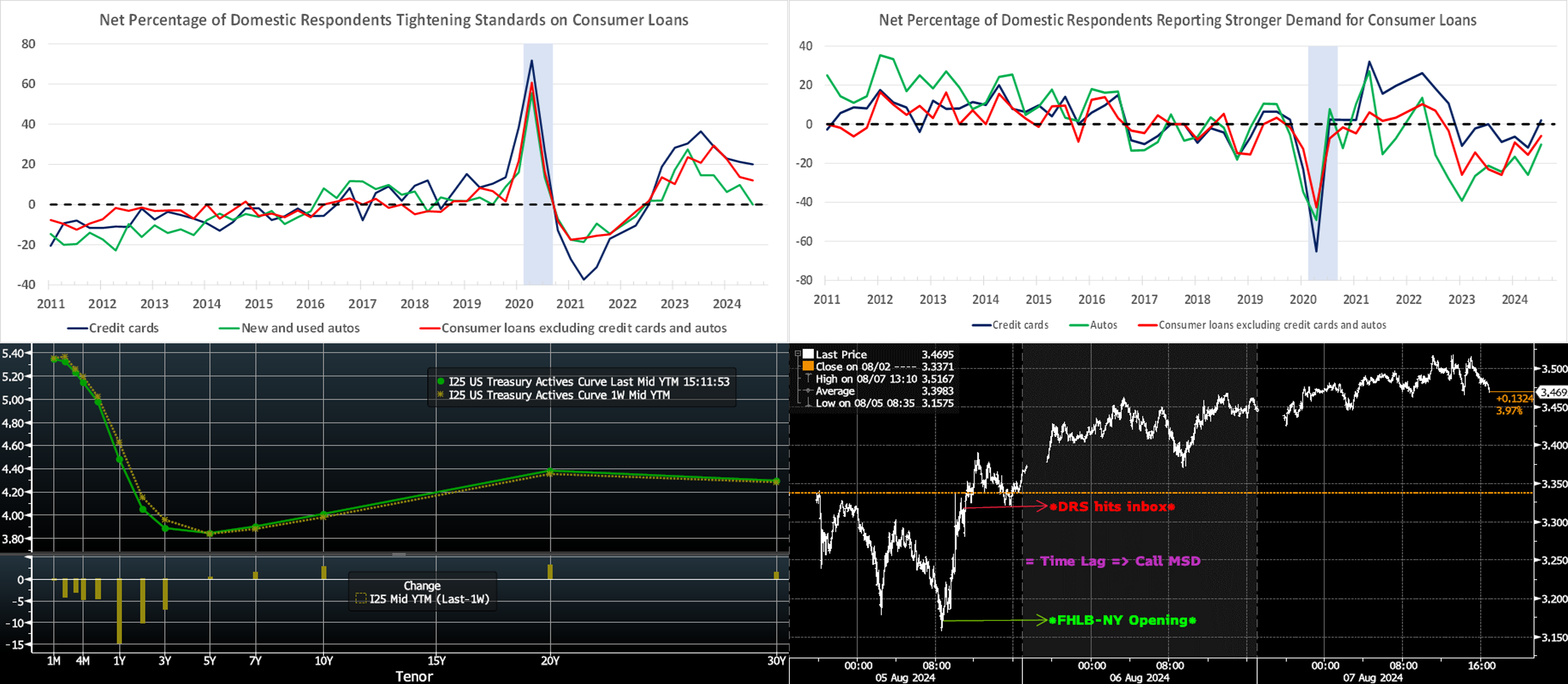 Source: Bloomberg. Here we serve our periodic reminder to contact the desk in times of market volatility. Shown here is the SOFR 5-year swap rate (RHS, %) in 5-minute intervals in the first few days of the week. After closing at 3.337% on August 2nd, it opened the week ~3.17% on the 5th, owing to market stress and volatility that spurred declines in both stocks and bond yields. Note that FHLB-NY is generally open for term business ~9 a.m. Also important to keep in mind is that our Daily Rate Sheet (“DRS”) is based on pricing from this opening timeframe; therefore, especially for term fixed rates, the DRS may reflect stale rates by the time it hits your inbox near 11 a.m. Our term rates move constantly with market rates. Given this dynamic, we highly encourage members to engage with the desk early and often to get fresh indications or live levels and potentially capture more advantageous funding levels to better serve your net interest margin metrics. We also encourage members to contact us for information and context on market moves. As of this writing on midday Thursday, the 5-year swap rate was ~3.53%.