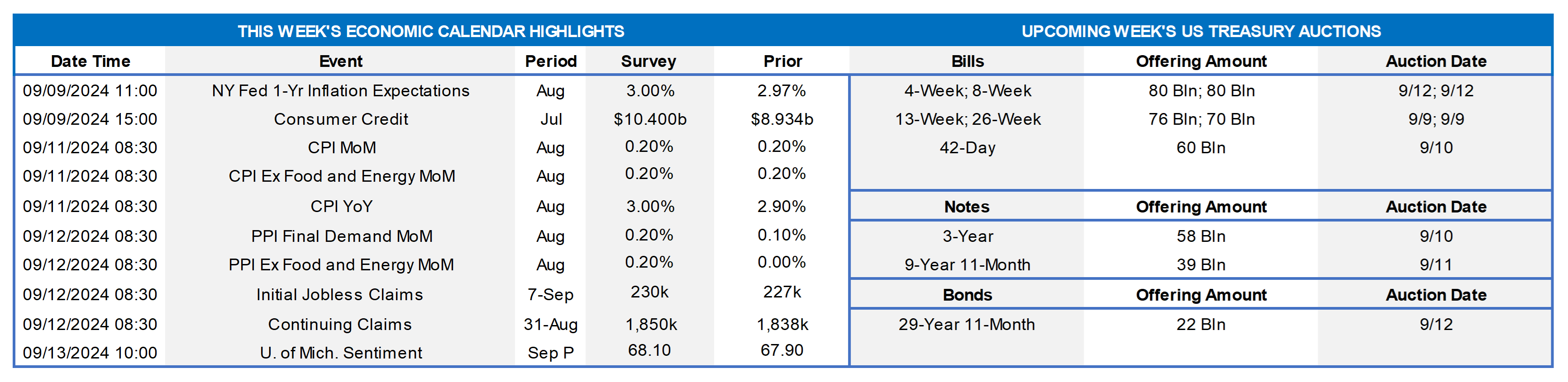 Following a week of employment-related data, the upcoming week will serve as a set of inflation data among a bevy of economic releases. Overall, and absent any major upside surprises, the data is expected to confirm the prevailing market sentiment that a 25-bps cut is a certainty at the September 18th FOMC, with a chance of an even-greater 50 bps cut. The Fed will be in blackout mode preceding the nearing FOMC, so economic data will be the primary focus of the market.