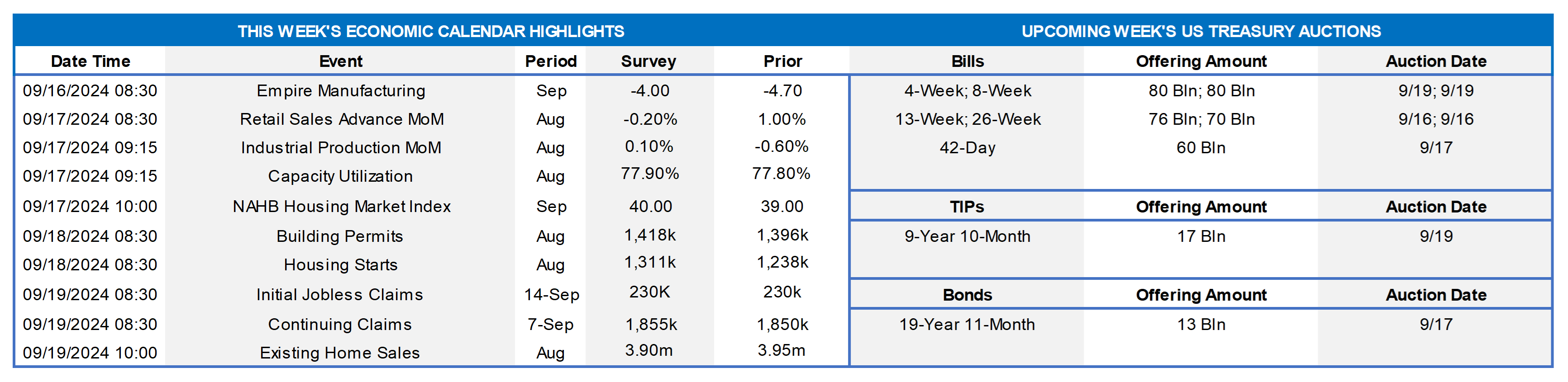 Source: Bloomberg; Board of Governors of the Federal Reserve System; FHLB-NY. The FOMC reduced the federal funds rate target range by 50 bps to 4¾% to 5% at this past week’s meeting, with policymakers updating their expectations for the course of administered rates through the end of 2027. Fed officials anticipate that an additional 50 bps of cuts in administered rates are likely over the balance of 2024, leaving the target range at 4¼ % to 4½% at yearend. Of note, the range of projections was slightly wider in absolute terms than those contained in the June release. The median call for end-2025 now entertains the possibility of a further 100 bps of rate cuts to 3¼% to 3½%, or 25 bps lower than previously forecasted. The median forecast for year-end 2026 calls for an additional 50 bps of reductions to 2¾% to 3%, which now represents the Fed’s new, slightly higher, projection for the federal funds rate to prevail over the longer run. While market pricing is largely in agreement with Fed officials as to where rates might bottom, it prices a notably faster easing pace that would largely finish by the end of 2025 – a full year ahead of policymakers’ median expectation.