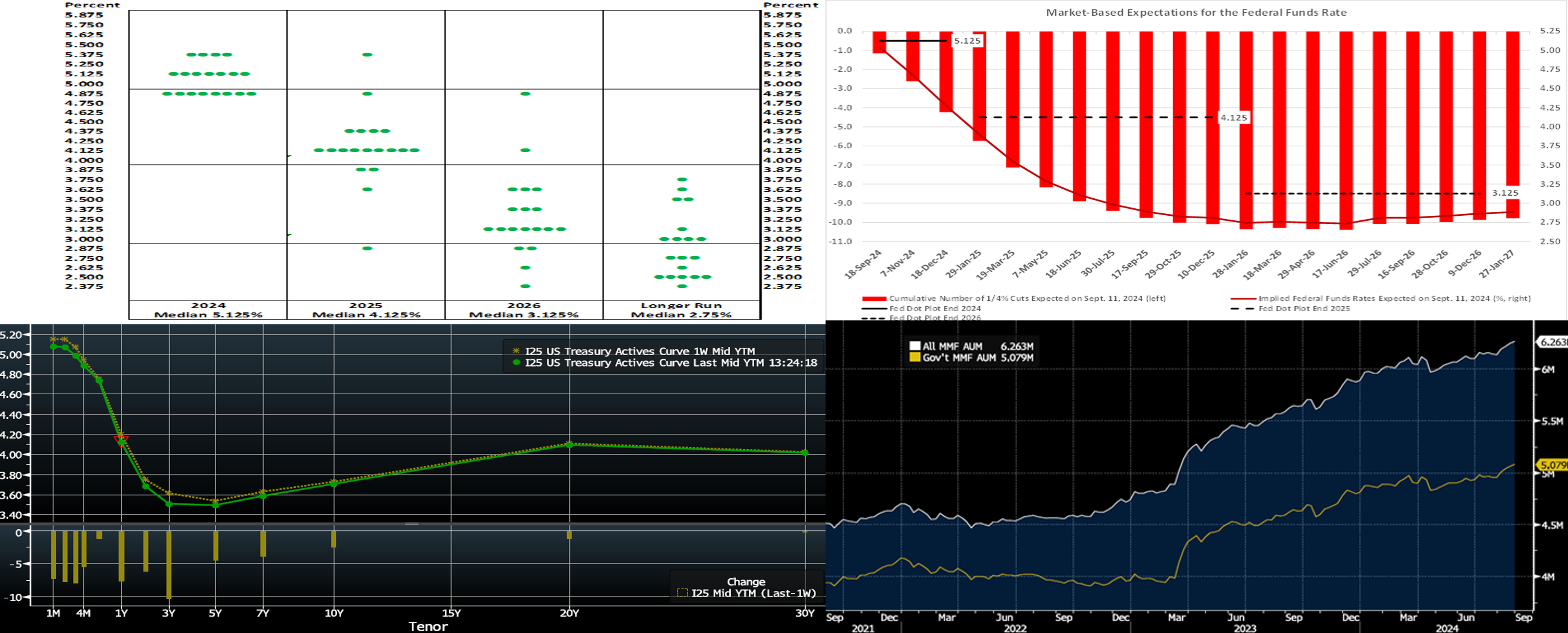 - Short-end rates were notably lower, relative to a week ago, owing to the Fed’s 50-bps cut. While the Overnight rate dropped ~50 bps, the 1- to 6-month tenors declined by 24 to 28 bps, as the market had priced into the curve last week only ~50% chance of a 50-bps cut. Money Market Fund AUM remains robust, thereby underpinning demand for short paper. Net T-bill issuance should decline in the weeks ahead, owing to the just-passed corporate tax date, and likely help spreads on our paper.