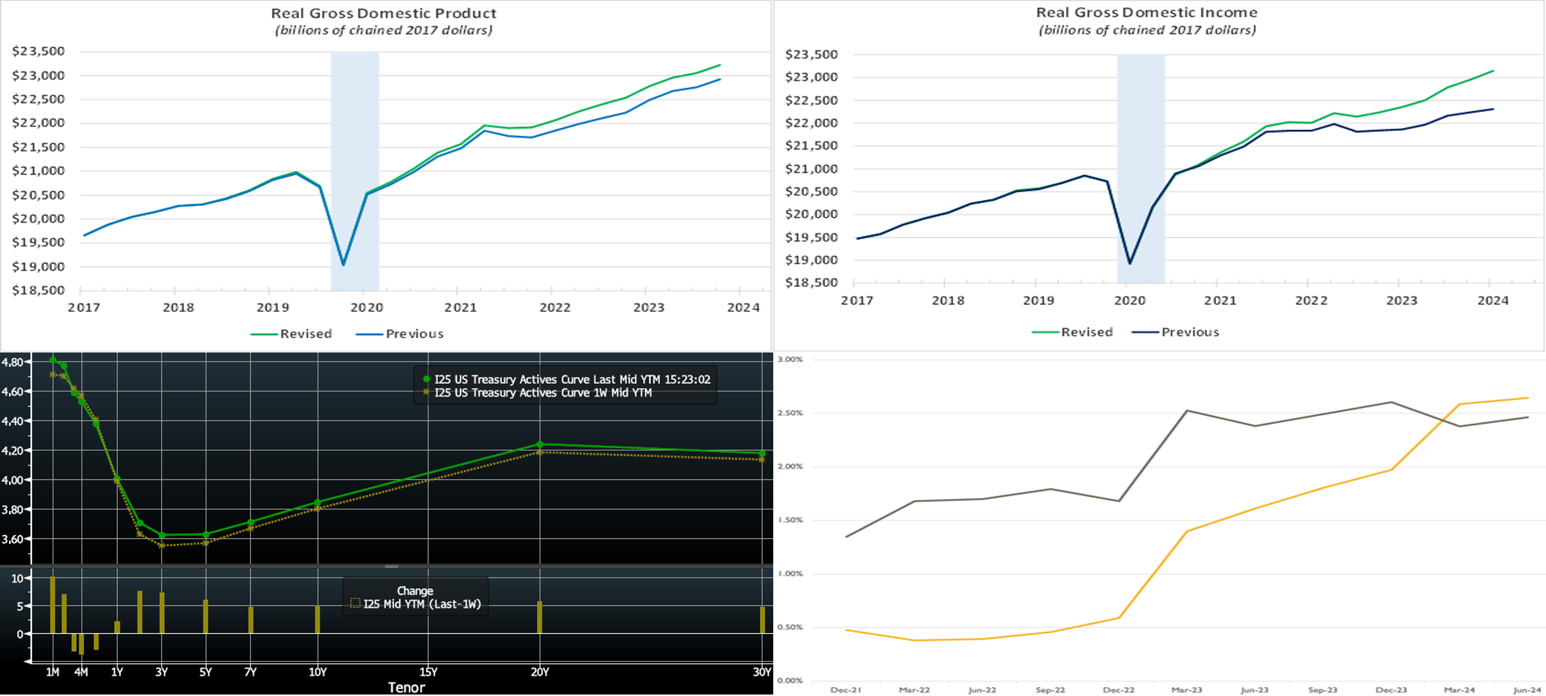 Source: Bloomberg. Top pane is yield (LHS, %), bottom pane is change (LHS, bps). As of Thursday afternoon, the UST term curve was higher and slightly flatter week-on-week. While the 2-year was ~7 bps higher, the 5-year was ~6 bps higher. Economic data released this past week was again generally better than consensus expectations. However, the market was somewhat marking time until the “first-tier” unemployment situation report was released Friday, the morning after this writing. In terms of market-implied pricing of the Fed, for end-2024, the market now prices for Fed Funds at 4.16%, 6 bps higher than last week but still below the Fed’s latest “dot plot” projection of 4.375%. The market prices end-2025 ~3.02%, ~10 bps higher than last week, and which is also still below the Fed’s projection of 3.375%; the market, in sum, “agrees” with the Fed’s long-run median projection on Fed Funds ~2.875% but prices the Fed to act in much quicker fashion to get there.