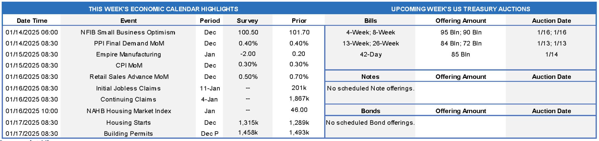 - Jan. 14 Kansas City Fed President Schmid to speak on monetary policy and the outlook to the Central Exchange in Kansas City.