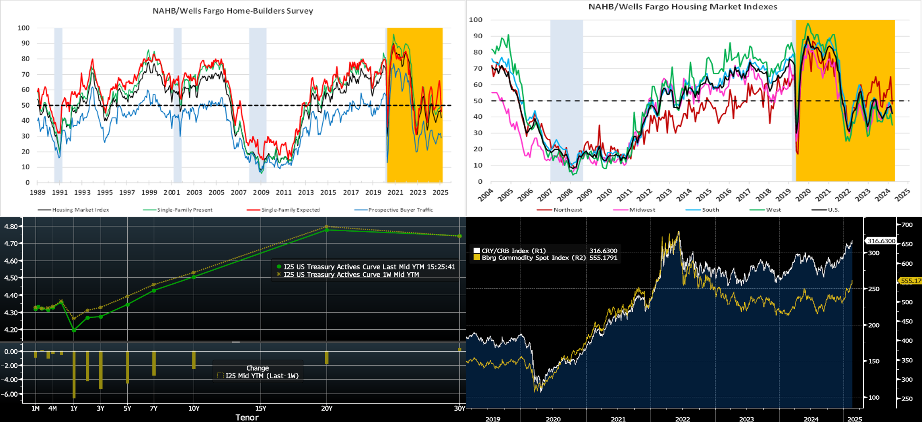 Source: National Association of Home Builders/Wells Fargo; National Bureau of Economic Research. Notes: Blue-shaded areas denote recessions; orange-shaded areas highlight current expansion. The Housing Market Index – a composite gauge of homebuilders’ appraisals of current and future sales and prospective buyer traffic – retreated to a five-month low of 42 in February. While builders hold hope for pro-development policies from the Trump administration, particularly for regulatory reform, policy uncertainty, and cost factors prompted a reset of expectations this year. Builder confidence had surged following November’s election as contractors looked forward to less regulation and the prospect of more economic growth. However, the administration’s plans for tariffs on Canada and Mexico, delayed until at least March and a 10% levy already in effect on Chinese goods threaten to raise prices in an industry currently struggling to retain buyers. Indeed, with 32% of appliances and 30% of softwood lumber coming from international trade, tariff uncertainty has inspired builder concerns about costs. Moreover, with home prices near record highs nationwide and rates likely to remain elevated for the foreseeable future, incentives may be losing their power with a limited pool of eligible buyers. The shares of builders who cut prices or used sales incentives both declined in February. Builder sentiment in the Northeast, previously the rosiest, suffered the biggest drop during the reference period, plunging by 17 points to 48 – the biggest drop since April 2020 at the height of the global pandemic.