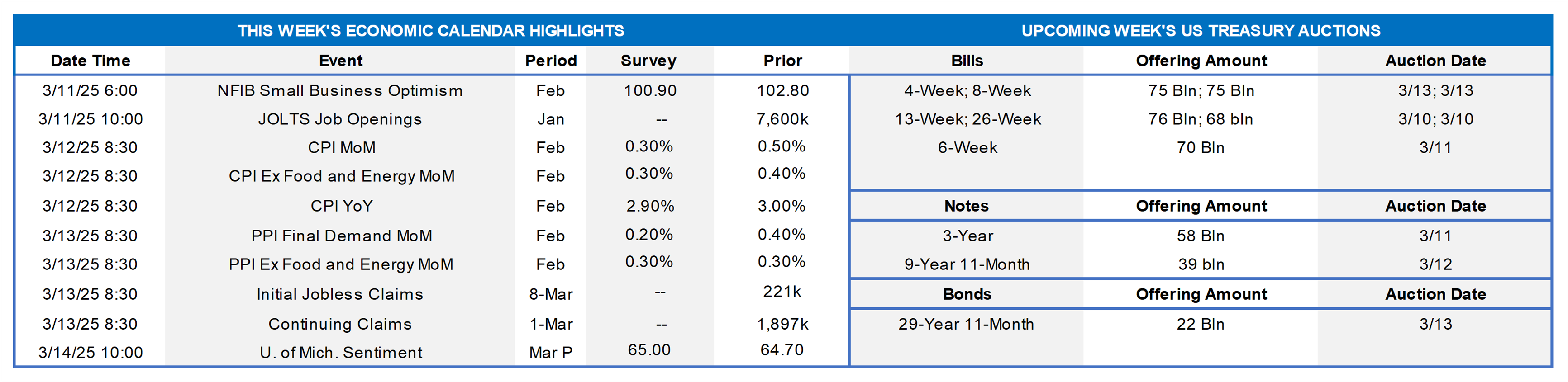 - On the UST term supply front, the upcoming week serves a heavy slate of 3/10/30-year auctions. Note that UST auctions usually occur at 1 p.m. and can occasionally spur volatility around that time. Please contact the Member Services Desk for further information on market dynamics, rate levels, or products.