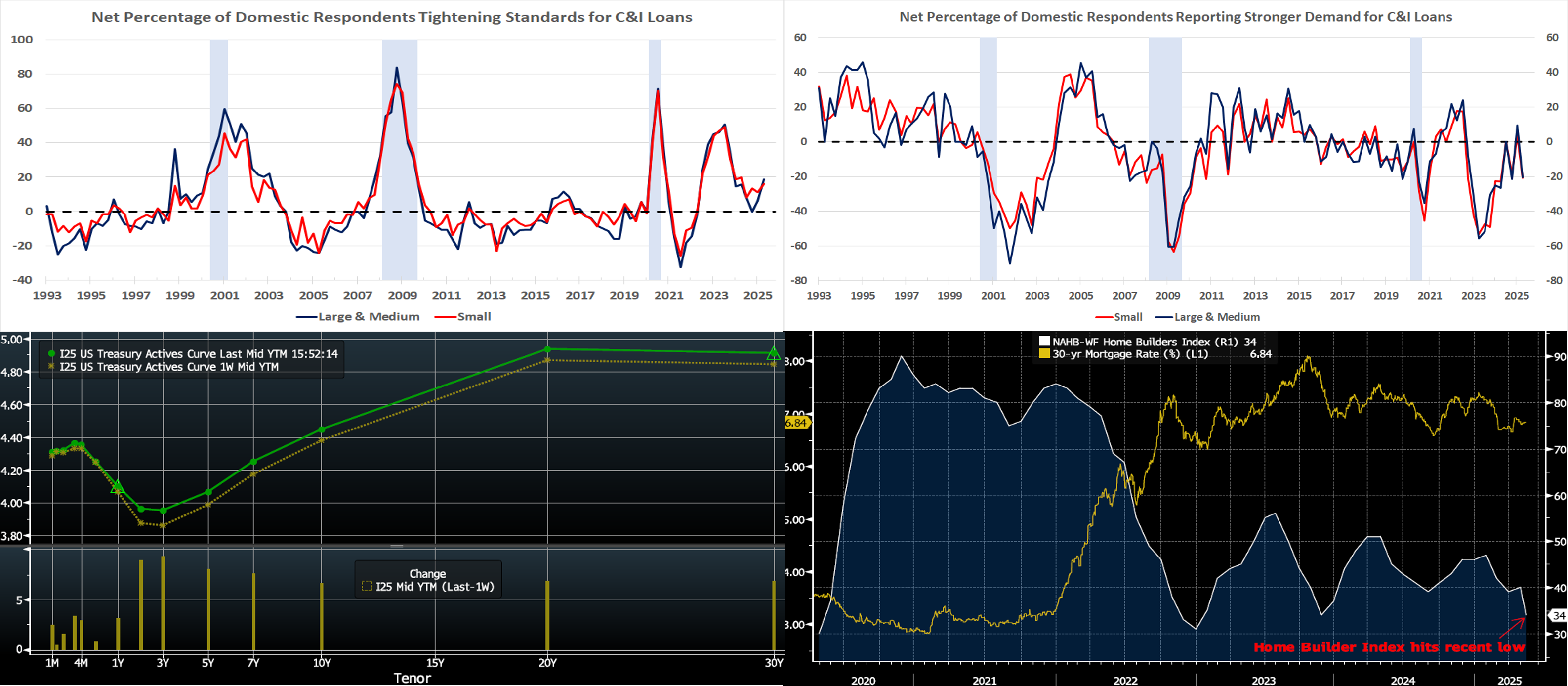 Sources: Board of Governors of the Federal Reserve System; National Bureau of Economic Research; FHLBNY. Notes: Blue-shaded areas denote recessions. Released this week, the Federal Reserve’s Senior Loan Officer Opinion Survey on Bank Lending Practices revealed that commercial banks tightened credit standards for commercial & industrial (C&I) loans amid weakened demand during Q1. Indeed, the net percentage of domestic loan officers reporting tighter standards for such borrowings by large and medium-market firms jumped to a six-quarter high of 18.5%, while that for smaller entities with less than $50mn in annual sales rose by almost five percentage points to 15.9% – the most restrictive reading since the winter of 2024. The net percentages of bankers witnessing increased demand for C&I loans by firms with more than $50mn in annual sales slumped to -20.3% during the reference period from 9.4% last fall, while the barometer for smaller entities dropped from 3.2% to -20.6%. Among banks that reported having tightened standards and terms for C&I loans, major net shares cited a less favorable or more uncertain economic outlook, increased concerns about the effects of legislative changes, supervisory actions or changes in accounting standards, the worsening of industry-specific problems, and a reduced tolerance for risk as important reasons for doing so. The most frequently cited reasons for weaker demand, as reported by major net shares of banks, were decreased customer investment in plant or equipment and decreased customer financing needs for mergers or acquisitions. While not charted herein regarding commercial real estate (CRE) loans, banks also reported tighter or basically unchanged lending standards amidst weaker or basically unchanged demand. For residential real estate loans, banks reported basically unchanged lending standards and weaker demand.