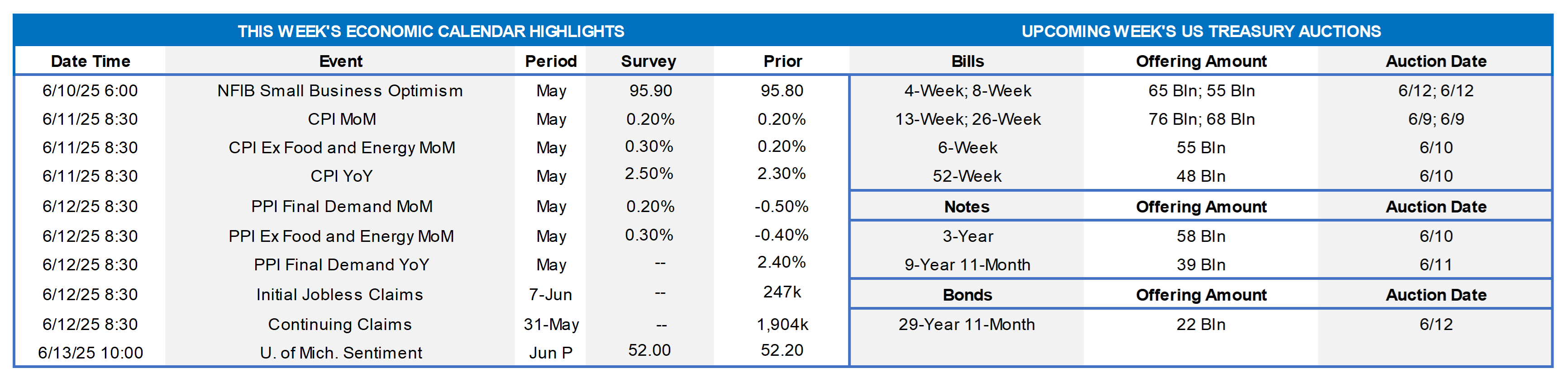 Market participants likely will face a quiet week, at least on the data front. With the May employment report in the rearview mirror, the market’s focus will shift to reports on the inflation side of the Federal Reserve’s dual mandate. Meanwhile, hopes for positive developments on the international trade front probably lifted the spirits of consumers and small businesses in upcoming reports. Monetary policymakers will be silent during the traditional blackout period ahead of the June 17-18 Federal Open Market Committee meeting.